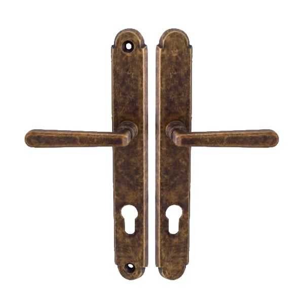 Štítová kľučka na vchodové a bezpečnostné dvere so spevneným rustikálnym štítom bez prekrytia cylindrickej vložky je vyrobená z materiálov vysokej kvality – mosadz a je povrchovo upravená. Rustikálny štít má rozmery 38 mm x 280 mm a hrúbku 11 mm.