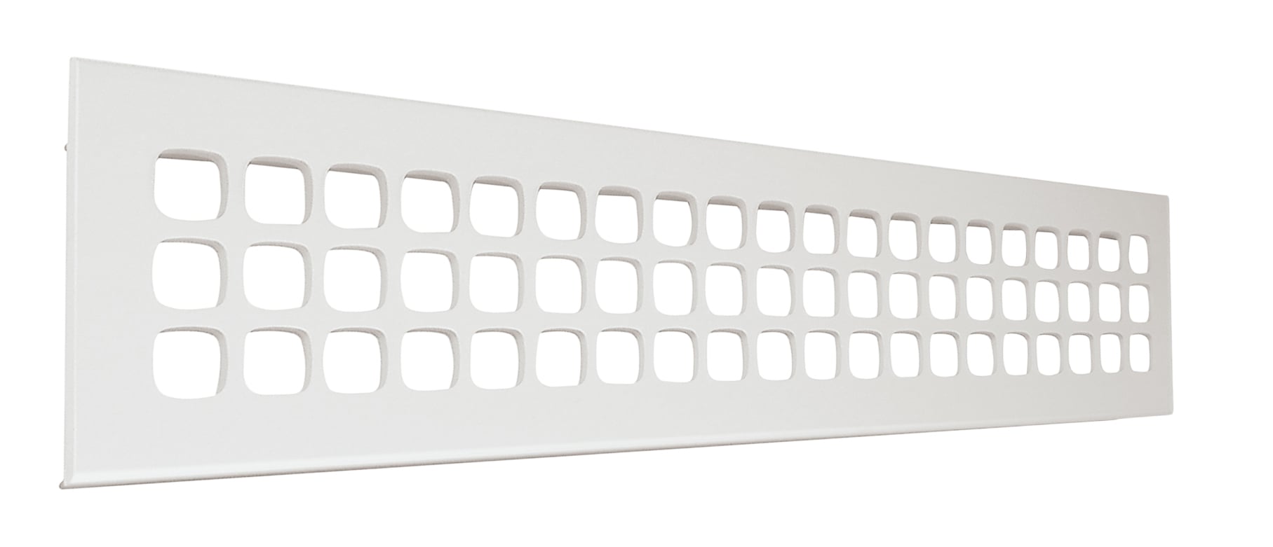 MONTÁŽ: dĺžka montážneho otvoru je o 25 mm kratšia ako je celková dĺžka mriežky (t. z. 12,5 mm z každej strany), šírka montážneho otvoru je o 14 mm užšia ako je celková šírka mriežky (t. z. 7 mm z každej strany).